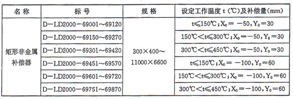 矩形非金屬補償器根據不同的工作溫度和補償量進行分類,編目如下: